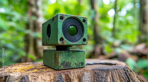 speaker, vintage, green, cube, nature, forest, stump, wood, equipment, sound, technology, outdoors, relaxation, leisure, environment, summer, park, music, acoustic, square, design, old, rustic, greenery, foliage, calmness, hobby, aesthetic, tranquil, natural, noise, device, object, wilderness, scenic, remote, closeup, art, setting, beautiful, sustainable, lifestyle, unique, photo, detailed, creative, peaceful