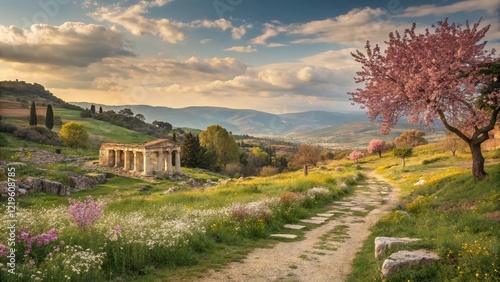 ancient greece, oil painting, impressionism, springtime, spring flower, sunset, sunrise, fine art, home decor, greece, landscape, painting, art, spring, vintage, history, culture, travel, photo, artistic, beautiful, scenic, nature, ancient, classical, ruin, architecture, mediterranean, flora