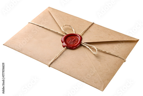 Vintage kraft paper envelope sealed with red wax isolated on transparent background