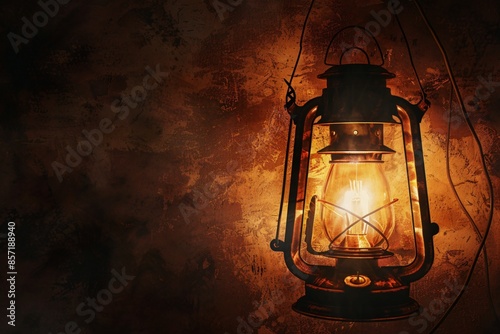 Vintage lantern with a warm glow on a dark brown background nostalgic and cozy open space around for text