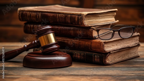 Vintage Law Books with Gavel and Glasses on Wooden Table Surface