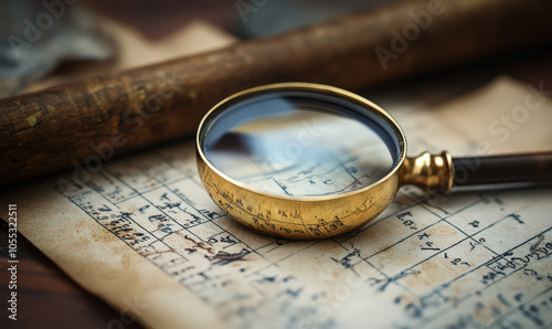magnifying glass, vintage, antique, brass, music, sheet music, paper, old, parchment, manuscript, document, closeup, detail, texture, brown, wood, aged, weathered, history, research, science, discovery, exploration, curiosity, cognition, wisdom, mystery, secret, clue, detective, scholar, library, archive, collection, rare, unique, valuable, object, tool