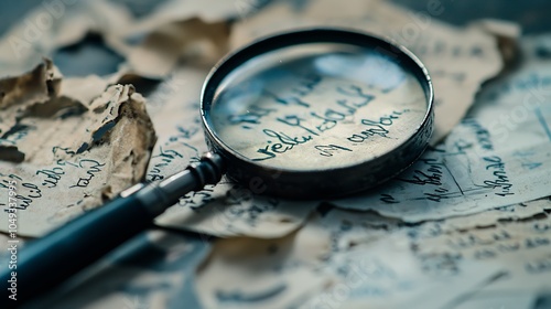 Vintage magnifying glass on aged manuscript for historical research insights : Generative AI