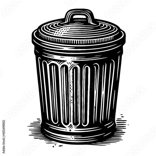 Vintage Metal Garbage Trash Can with Lid Black and White Outline Line Art Drawing Engraving Style