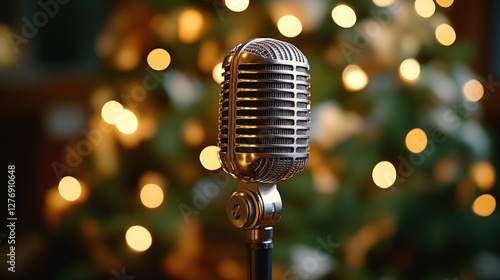 microphone, vintage, christmas, light, tree, holiday, music, audio, recording, performance, celebration, festive, decoration, ambient, warm, cosy, speech, sound, acoustic, studio, gift, family, event, ornament, singing, stage, show, party, home, celebratory, background, bokeh, light, blur, retro, classic, gold, closeup, christmas party