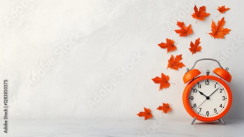 Vintage orange alarm clock on marble table with scattered autumn leaves on textured white background, evoking seasonal change and nostalgia