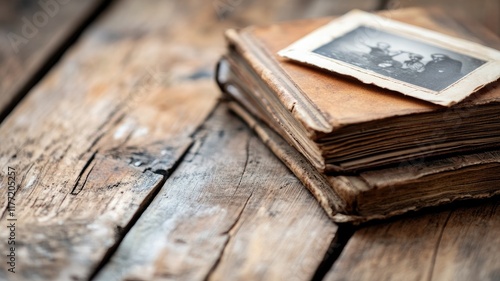 Vintage photo on weathered wooden table with old book, evoking memories and history