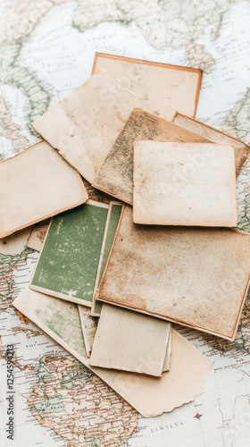 Vintage postcards on world map depicting nostalgic travel memories and global exploration concept