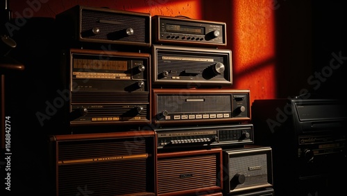 Vintage radios stacked against a warm-colored wall, illuminated by soft light in a retro setting