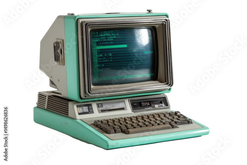 Vintage retro computer with green screen and keyboard from 1980s technology era, cut out