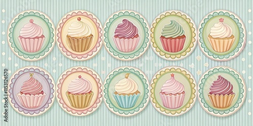 Vintage Retro Cupcake Bakery Badges and Labels , Pastel Colored, Edible Images