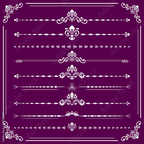vintage, frame, set, horizontal, ornament, element, classical, royals, monogram, greeting, label, classic, design, decoration, flower, floral, curl, orient, oriental, signs, line, curve, template, graphic, old, drawing, card, victorian, illustration, object, decorative, accent, typographic, invitation, antique, background, pattern, luxury, holiday, collection, congratulation, wedding, colours, monochrome, purple, white, coloured