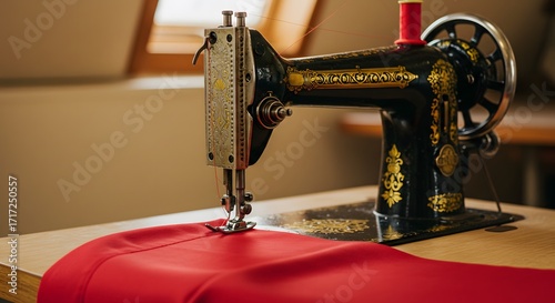 Vintage sewing machine sewing red fabric