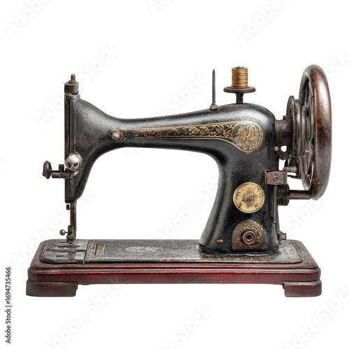 sewing, machine, vintage, antique, metal, ornate, gold, detailing, wooden, footed, thread, spool, mechanical, old, retro, isolated, transparency, background, tool, craft, textile, fabric, needle, manual, equipment, hobby, stitching, tailor, workshop, classic, rustic, worn, decorative, black, metallic, closeup, object, industry, traditional, old-fashioned, detailed, textured, hobbyist, creative, hand-made, repair, style, accessory