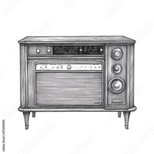 vintage, stereo, console, radio, television, retro, antique, audio, music, illustration, hand-drawn, drawing, monochrome, black-and-white, vignetting, graphic, design element, 1950s, 1960s, nostalgic, classic, old