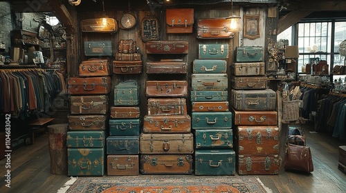suitcase, vintage, antique, travel, baggage, wooden, wall, stacked, brown, green, old, retro, leather, brass, metal, worn, distressed, faded, textured, rustic, room, interior, shop, store, display, clothing, rack, garment, apparel, floor, carpet, rug, light, lamp, clock, picture, frame, basket, pursed, purse, style, design, aesthetic
