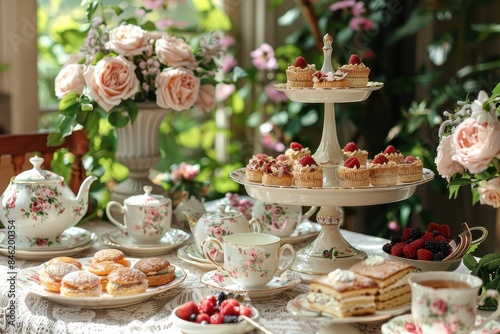 tea, party, vintage, antique, retro, nostalgic, elegant, sophisticated, refined, delicate, floral, china, porcelain, cup, saucer, plate, teapot, pastry, cake, cookie, sweet, savoury, assorted, varied, colourful, decorative, ornate, detailed, intricate, lace, tablecloth, fabric, textile, setting, arrangement, presentation, display, table, centrepiece, decor, ambience, atmosphere, mood, occasion, celebration, gathering, social