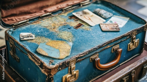 vintage, suitcase, travel, trunk, retro, antique, memory, photograph, map, journey, exploration, adventure, nostalgia, past, history, global, wanderlust, blue, worn, aged, old, rustic, case, baggage, baggage, voyage, expedition, discovery, destination, souvenir, patina, texture, graphic, detail, picture, card, earth, classic, bequest