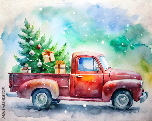 truck, christmas, tree, gift, winter, snow, vintage, festive, holiday, decoration, red, present, landscape, serene, transport, vehicle, conifer, celebration, light, ornament, nature, scenery, seasonal, cosy, snowflake, joy, gathering, warm, scene, atmosphere, nostalgia, tradition, rustic, winter landscape, family, community, cheer, happiness, artsy, watercolor, colours, calmness, culture, decor, festivity, rural, equipment