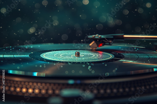 Vintage Vinyl Record Player with Sparkling Bokeh Background in Low Light