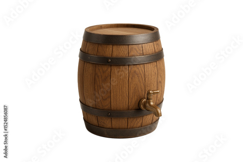Vintage wooden barrel with brass tap isolated on transparent background. Rustic oak keg for wine, whiskey, or craft beer storage and pouring. Traditional brewery equipment, perfect for pub, bar