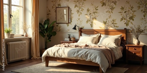 Vintage wooden furniture, soft morning light, cozy bed, floral wallpaper , retro, furniture