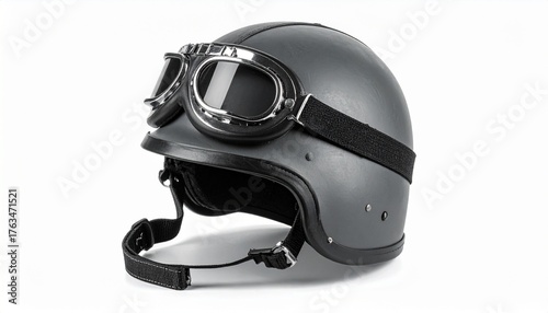 Vintage-style matte gray motorcycle helmet with black and silver goggles on white background for editorial motorcycling gear safety equipment and retro design-themed visuals