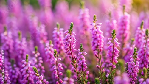 Violet heather flowers field with small pink lilac petal plants in soft background, shallow depth of field, high angle view