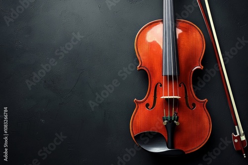 violin hanging on a dark studio wall, its polished wood finish gleaming subtly against the shadowy background. The violin's bow is positioned next to it
