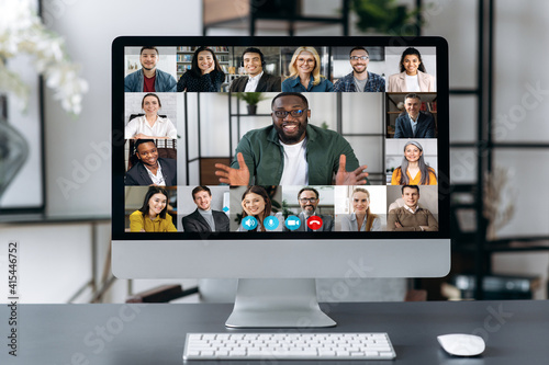 Virtual business meeting, online briefing, brainstorm. A computer monitor is on the desktop, on the screen is many different multiracial business partners gathered in a video conference