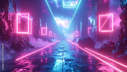 virtual reality environment with floating geometric shapes, neon light