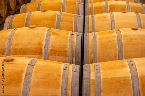 Visit of undergroud caves witn wine barrels in Cahors wine production area, red malbec wines, wine tasting in chateau, France
