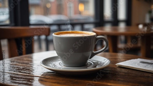 Vista cercana de una taza de café en una cafetería con fondo desenfocado y ambiente cálido