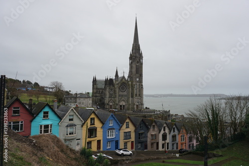 Vista de la Catedral de Cobh sobre las casas de colores