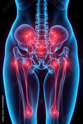 Visual illustration of the female pelvis highlighting joint and nerve structures