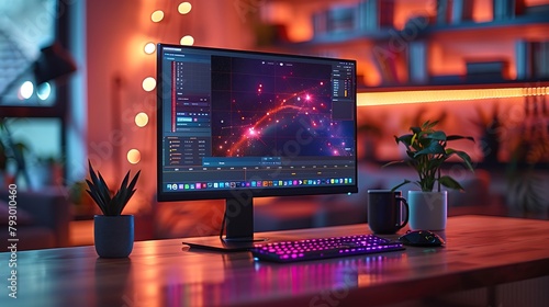 Visualize a PC monitor in a creative studio setting, displaying a dynamic project management dashboard that combines a Gantt chart with real-time team collaboration features.