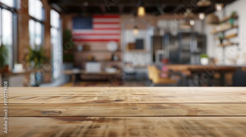 visualize a scene with a clean table top showcasing working location, with a blurred background and a USA flag theme