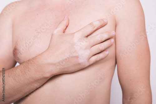 vitiligo. young guy with skin spots, skin disease. a man on a white background shows body parts with skin lesions