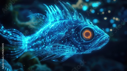 Vivid 3D close-up of a bioluminescent fish with an alluring glow amidst the dark sea environment