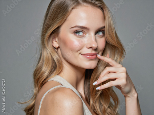 beauty, face, people, person, smiling, fashion, happy, up, ok, expression, emotion, hand, pointing, woman, single, portrait, blond, style, colours, diverse, lighting, young, advertisement, smile, grey, alone, highlight, commercial, beige, head shot, model, chin, thinks, ceo, wave, soft, natural, plain