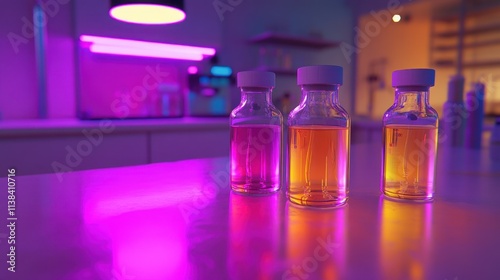 Vivid chemical solutions in glass containers, lit by bright laboratory lights, creating a realistic and vibrant scene.