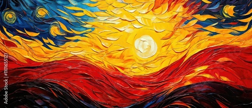 abstract, landscape, high-coloured, sunburst, fantasy, radiant, warm, colourful, sun, art, painting, dynamic, creative, imaginative, flowing, vibrant, swirl, bold, energetic, yellow, red, blue, orange, contrast, curved, expression, original, decorative, unique, artistic, visual, pattern, bright, wave, texture, movement, brilliant, design, stylised, chromatic