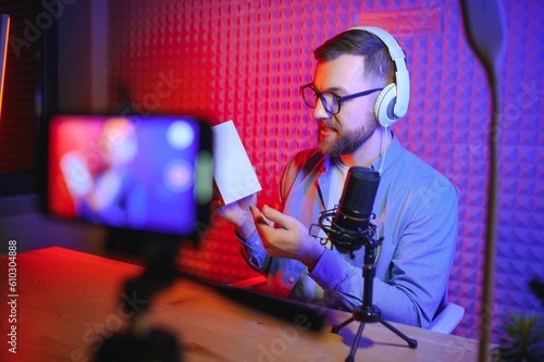 vlogger using smartphone to film podcast in studio. blogger with mobile phone, microphone and headphones filming video for social media broadcasting career.