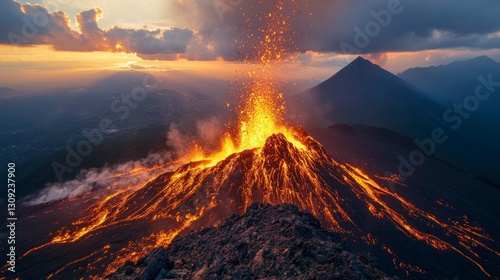 volcano, eruption, lava, magma, crater, geothermal energy, fire, landscape, natural phenomenon, sunset, cloud, mountain, heat, explosion, nature, geology, terrain, smoke, lava flow, topography, beauty, environment, active volcano, vivid colors, majestic, earth science, public safety, risk, monitoring, volcanic ash, natural disaster, planet earth