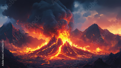 Volcanic eruption in a mountainous region. Lava Ridge. Illustration