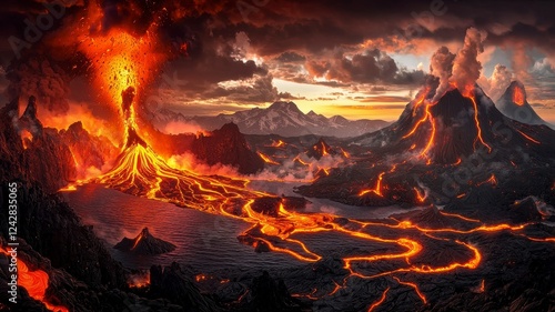 Volcanic eruption tectonic concept. A dramatic volcanic landscape with erupting lava, smoke, and fiery colors against a darkening sky, showcasing nature's raw power.