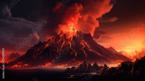volcano, eruption, lava, fire, mountain, sky, red, orange, smoke, cloud, nature, landscape, dramatic, digital, art, artwork, illustration, magma, geologic, phenomena, earth, power, destruction, heat, light, dark, bright, contrast, texture, rock, ground, horizon, intense, spectacular, force, fiery, danger, beauty