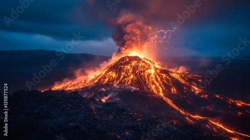 volcano, eruption, lava, ash, lightning, natural disaster, landscape, nature, fire, dangerous, power, night, geology, mountain, environment, disaster, hot, dark, cloud, geologic, destruction, energy, magma, burning, intense, earth science, danger, dramatic, natural, scenic, rage, igneous, geothermal, geothermal energy, active volcano, fiery, night time, storm, dramatic sky