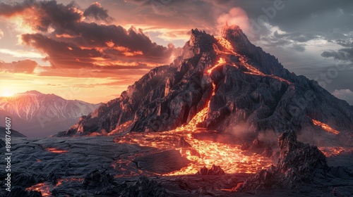 volcanic, mountain, clip art, digital, artwork, volcano, landscape, realism, nature, eruption, lava, scenic, dramatic, terrain, illustration, three-dimensional, photorealistic, graphic, render, artistic, visual, natural, geology, mountainous, fiery, hot, detailed, earth, power, majestic, smoke, mountain, imagery, textured, animation, heat, intense, vibrant, dynamic