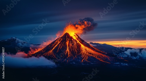 volcano, eruption, lava, mountain, sunset, fire, smoke, nature, landscape, dramatic, night, sky, dark, light, energy, power, geology, earth, magma, explosion, hot, orange, red, cloud, peak, scene, view, rock, hazard, disaster, travel, photo, illustration, background, texture